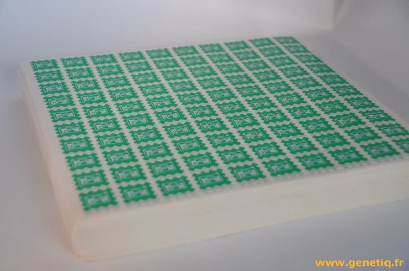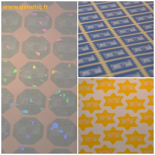 Nous pouvons aussi ajouterdes découpes de sécurité dans l'étiquette(pour qu'elle se déchire si l'on veut l'enlever) ou encore imprimer votre logo en dorure, ce qui le rend impossible à photocopier et ajoute du cachet au document.