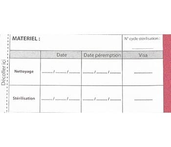 This la bel has a pink sterilisation strip, which turns brown after a 15-minute cycle at 125°C in a steam autoclave. The change in colour of the sterilisation indicator confirms to the surgeon or doctor that the equipment has been sterilised.