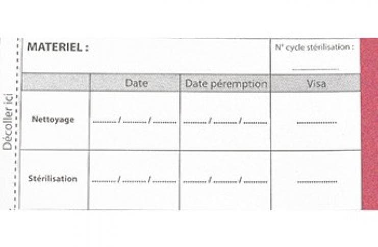 Cet te étiquettea une bande de stérilisation rose, quivire au marron après un cycle de 15 minutes à 125°Cdans un autoclave vapeur. Ellepermet de sécuriserle chirurgien ou le médecin en lui confirmant grâce auchangement de couleur du témoin de stérilisationque son matériel est bien stérilisé.